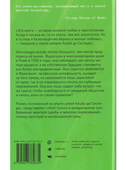 Роман, основанный на опыте самой Альбы де Сеспедес, представляет собой точное и вневременное изображение женской судьбы и женских переживаний, полных яростной и незабываемой силы.
