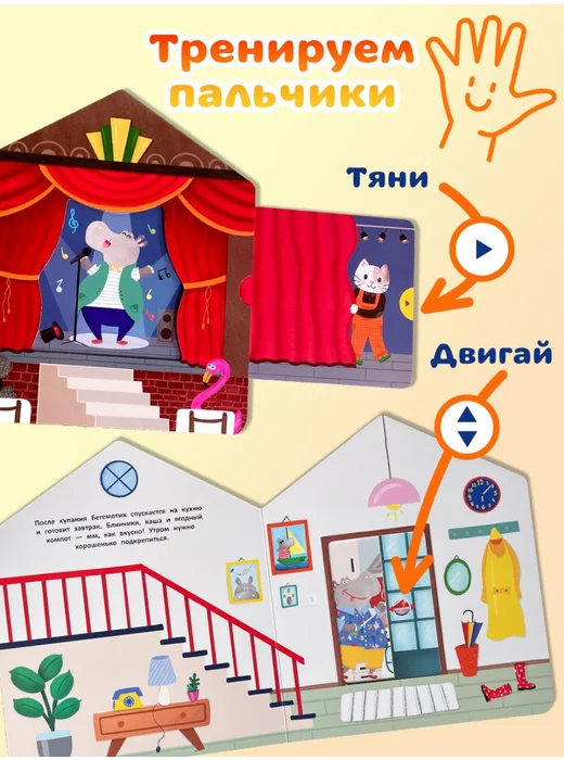 Интерактивные элементы помогают развивать мелкую моторику. Ребёнок сможет потянуть, покрутить и подвигать детали, тренируя пальчики. Книжки-игрушки предназначены для детей до 3-х лет, их приятно читать перед сном.