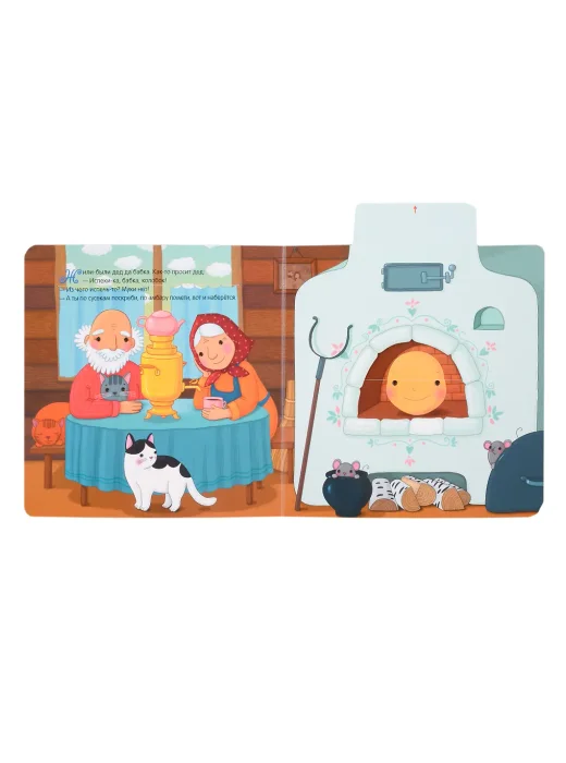 Любимая русская народная сказка о Волке и козлятах оживает на страницах интерактивной книги с колесиком, движущимися элементами, окошками и клапанами.