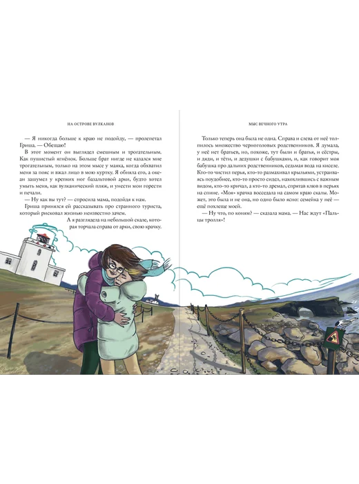 Каким бывает семейное путешествие? Шумным, бодрым, энергичным, весёлым! А если это семейное путешествие на остров, где можно найти больше ста вулканов? А если в дорогу отправляется Маша, которая любит порядок и козочек, шутник Гриша, который вечно попадает в передряги, строгий папа и мама-писательница? Каким будет это путешествие? Ясно одно: оно точно не будет скучным. Семья окунётся в мир викингов, попробует вулканический хлеб, полюбуется китами в музее и тупиками в открытом море, встретится с водопадами и гейзерами, искупается в горячих источниках, узнает название некоторых рун, купит молот Тора и даже заключит договор с эльфами! Не всё проходит идеально: дети и взрослые ссорятся и мирятся, обижаются и радуются. Главная находка, которая ждёт Машу, Гришу и их родителей на острове вулканов — это ощущение семейной поддержки и любви.