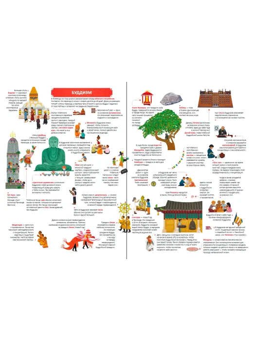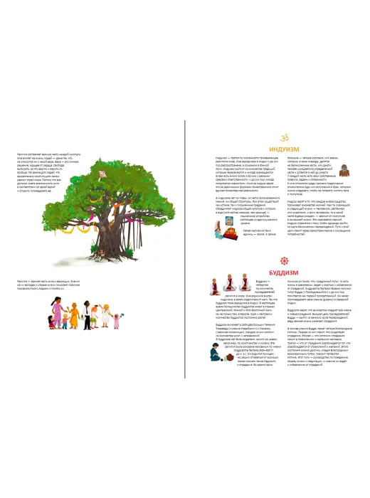 Настоящий путеводитель по пяти основным мировым религиям: она рассказывает о ритуалах, традициях, праздниках и символике индуизма, иудаизма, буддизма, христианства и ислама (религии представлены по численности последователей). Вы узнаете, что такое карма в индуизме, что символизирует цветок лотоса в буддизме, что празднуется в иудаизме в Песах, какое значение для христиан имеет святая вода и в какой стране живет больше всего мусульман. А сценки из повседневной жизни, представленные на красочных иллюстрациях-виммельбухах, погружают в атмосферу жизни разных народов настолько, что кажется, будто слышишь гул голосов или ощущаешь запахи на рынке!