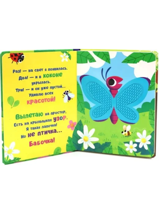 Загадки в стихах Юлии Весовой легко запоминаются, развивая память и речь ребенка. Трогая силиконовые вставки на иллюстрациях Clever книги, малыш развивает ловкость пальчиков и мелкую моторику. Тактильная книга для малышей «Кто я? В саду» познакомит детей с насекомыми. Какие крылья у бабочки? Какой домик у улитки? Потрогай, и узнаешь!