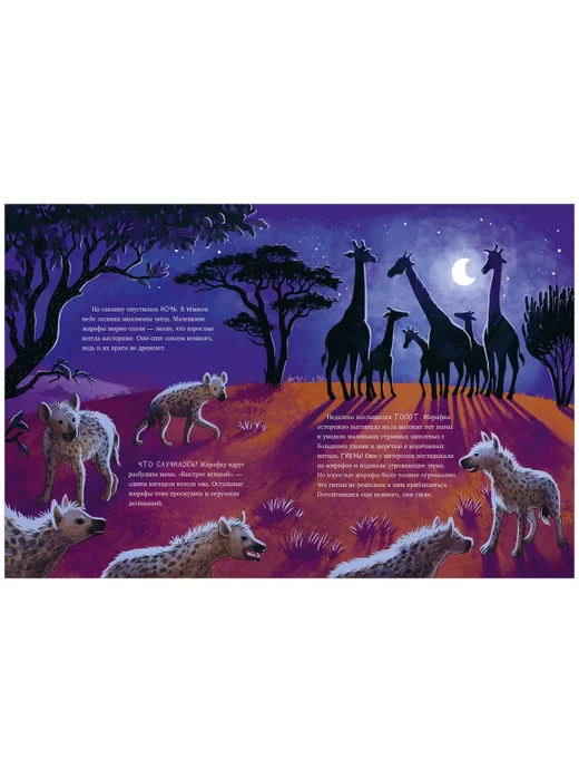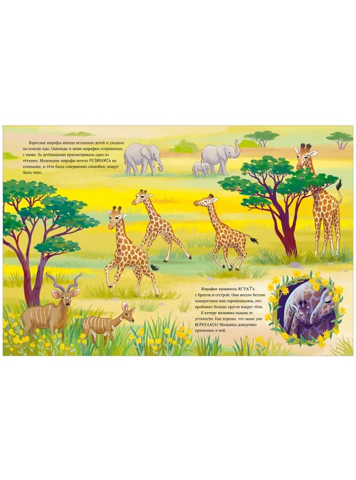 «Малышка-жираф. Приключения в саванне» — добрая история о приключениях маленькой жирафы, прекрасное первое чтение с большими детальными иллюстрациями. Книжка познакомит маленьких читателей с окружающим миром, с жителями жаркой Африки и с жизнью самых удивительных животных — жирафов. В жаркой африканской саванне на свет появилась малышка-жираф. Скоро она сделает первые шаги, распробует сочные листья акации, познакомится с другими животными, сделает много открытий и узнает все об удивительном мире вокруг!