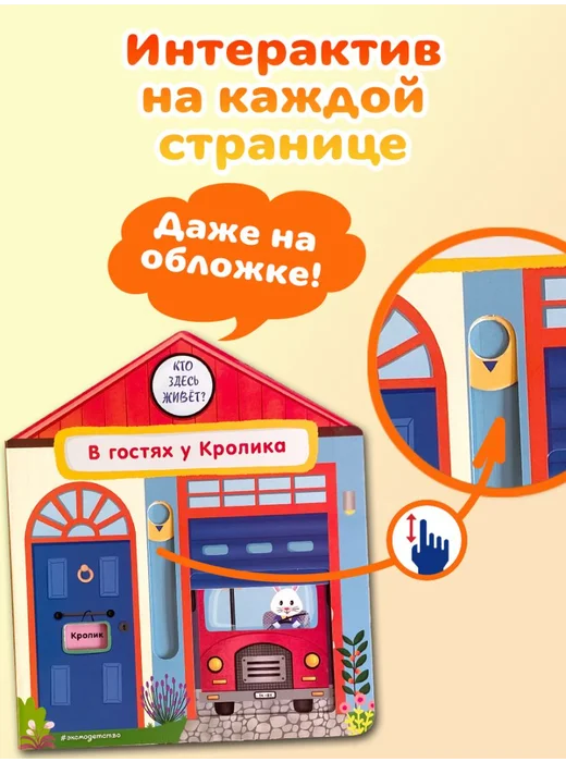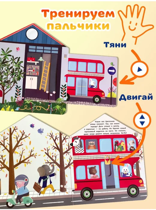 Интерактивные элементы помогают развивать мелкую моторику. Ребёнок сможет потянуть, покрутить и подвигать детали, тренируя пальчики. Книжки-игрушки предназначены для детей до 3-х лет, их приятно читать перед сном.