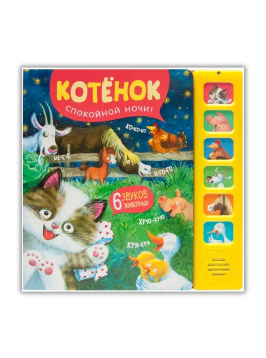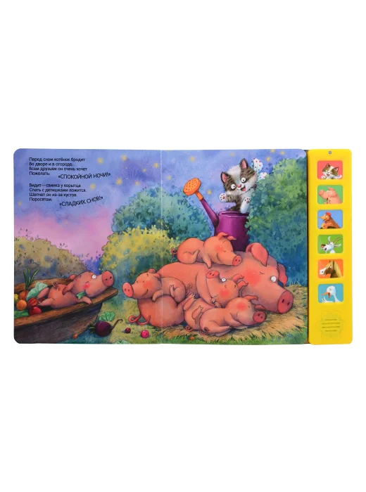 Эта замечательная звуковая книга с волшебными иллюстрациями Л. Ереминой и добрыми стихами обязательно понравится малышу. Вместе с забавным котенком он пожелает: «Спокойной ночи!» - лошадке, утятам, свинке, курице и другим домашним животным. Нажимая на кнопки, ребенок сможет послушать 6 разных звуков: кряканье утят, ржание лошадки и другие.