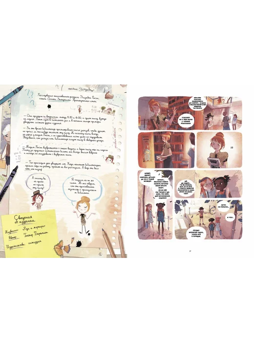 • Книга очень интересно устроена. В части, где она нарисована как комикс, мы видим, какие события происходят с Вишенкой, а в дневниковой части — как осмысляет эти события героиня и как она ведет свое детективное расследование.