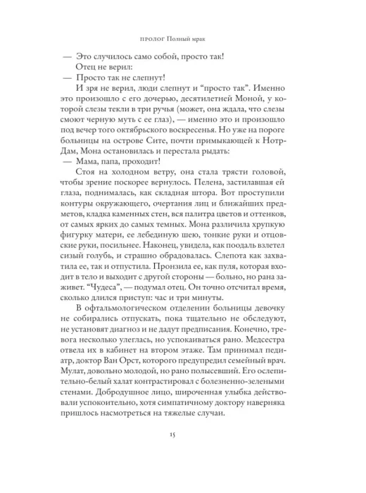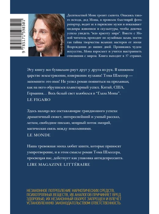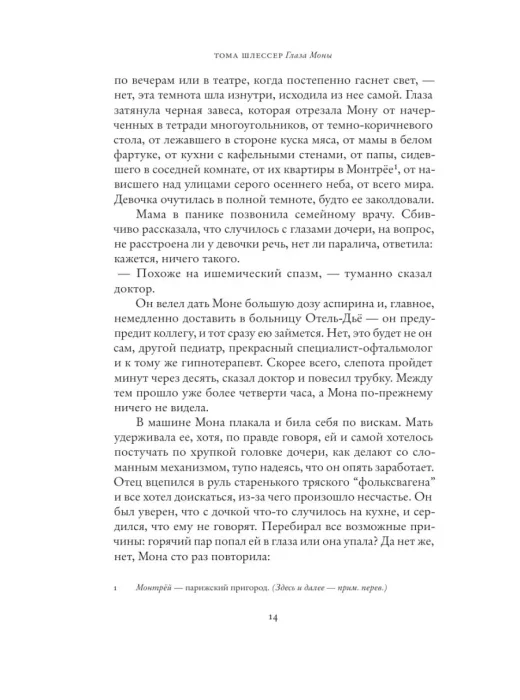 "Глаза Моны" Тома Шлессера — книга уникальная, "роман взросления" и одновременно увлекательнейшее путешествие в мир искусства. Десятилетняя Мона неожиданно теряет зрение. Ее внезапная слепота вскоре проходит, но опасность рецидивов сохраняется. Постепенно офтальмолог, который лечит девочку, приходит к мысли, что причиной таких приступов слепоты может быть пережитый Моной глубокий стресс. Однако вместо предписанных врачом визитов к психиатру ее дед, в прошлом блестящий фоторепортер, раз в неделю водит Мону в парижские музеи и показывает ей шедевры живописи и скульптуры, помогая почувствовать их красоту и проникнуться чудом искусства. Вместе с Моной и ее неотразимым дедом читатель проходит по музейным залам, постигая историю творчества великих мастеров от эпохи Возрождения до наших дней. Параллельно у Моны идет напряженная повседневная жизнь с непростыми проблемами, подчас далеко не детскими. Неделя за неделей, благодаря открывшимся ей горизонтам, Мона взрослеет и начинает не только понимать искусство, но и выстраивать собственные отношения с миром.