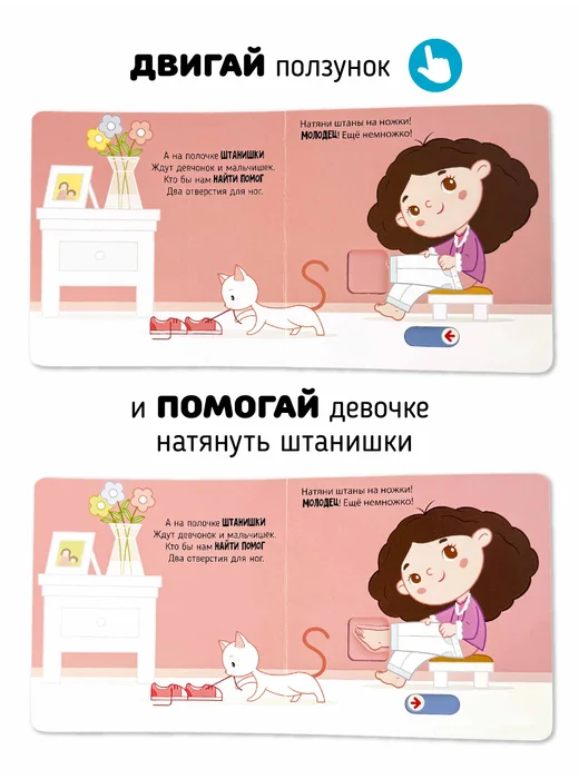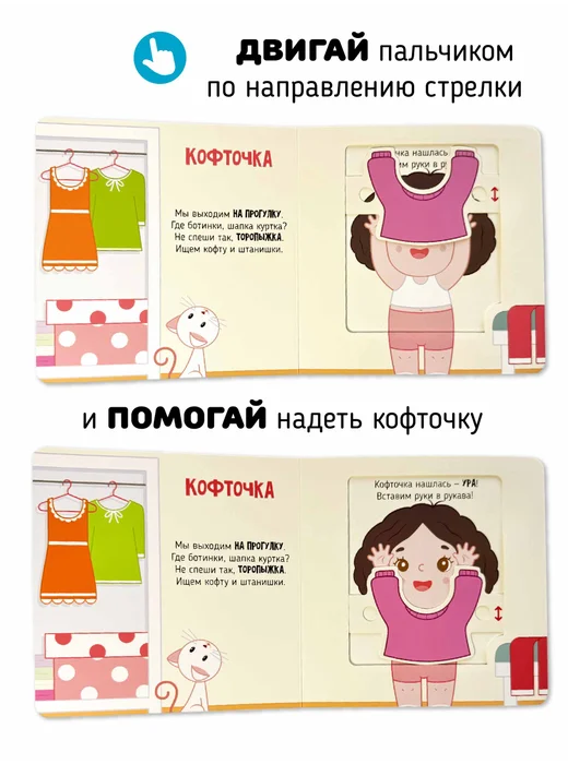 На прогулку собираясь, без подсказок я стараюсь все надеть как на картинке: кофту, штаники, ботинки. Книжка-малышка включает 5 крупных тактильных интерактивных элементов и простые задания, которые делают процесс чтения увлекательным.