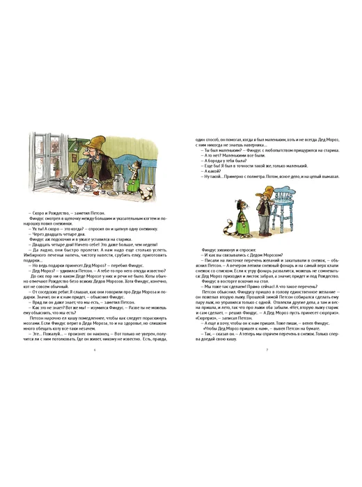 Старик Петсон и котенок Финдус готовятся к Рождеству. «Какое же Рождество без Деда Мороза?» — думает Финдус. «Но ведь Деда Мороза не существует, где его взять?..» — вздыхает Петсон. И тут ему в голову приходит блестящая идея: он сам сконструирует говорящего Деда Мороза! Мечта Фидуса сбылась, но, кажется, изобретение сработало не совсем не так, как думал Петсон… Так что же случилось на самом деле? Это новый перевод горячо любимой читателями книги. В нем исправлены неточности и пропуски. Самая загадочная и большая книга из серии о Петсоне и Финдусе. Сказка о настоящем рождественском чуде. В этой книге персонажей больше, чем в других историях. Хороший повод поговорить о существовании Деда Мороза