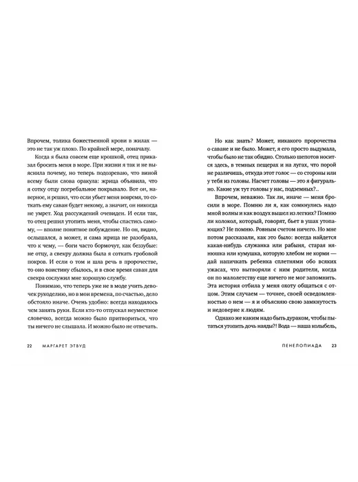 «Пенелопиада» — книга из серии древних мифов, переосмысленных современными писателями из разных стран, среди которых Антония Сьюзен Байетт, Али Смит, Давид Гроссман, Су Тун, Ольга Токарчук, Виктор Пелевин и др. Мудрая, сострадательная, тревожная история о том, что подчас бывает, когда власть в обществе принадлежит мужчинам. Что если Пенелопа — верная жена Одиссея, ждавшая его двадцать лет на Итаке и вырастившая сына Телемака, — задумала что-то, о чем забыл упомянуть Гомер? И какие тайны хранят двенадцать повешенных по приказу Одиссея служанок? Маргарет Этвуд предоставляет женщинам возможность рассказать свою версию легендарной истории.