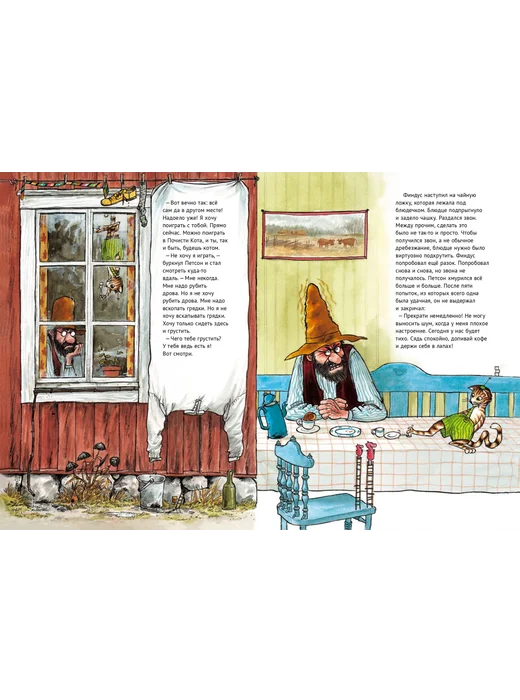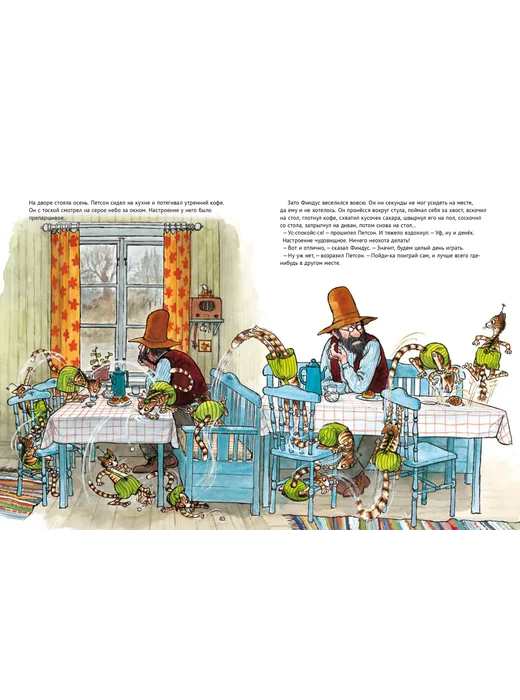 Наступила осень, и у Петсона испортилось настроение. Кого угодно огорчит серое небо и моросящий дождик. Впрочем, котенку Финдусу погода вообще нипочем: ловит себя за хвост, он веселится вовсю и предлагает Петсону поиграть с ним. Но Петсон ничего не хочет, он хочет только сидеть и грустить. Котенок пытается его расшевилить, зовет его на рыбалку, начинает ловить рыбу прямо на кухне, но Петсон по-прежнему с тоской смотрит в окно. Наконец Финдус добивается своего, и друзья идут на озеро, где после первой пойманной рыбы настроение у Петсона улучшается, и он видит, что осень едва ли не лучше, чем лето. Еще одно подтверждение того, что у природы не бывает плохой погоды. В этой книге можно увидеть плотву, которую Петсон поймал в 1933 году. Книга — лучшее средство от осенней хандры.