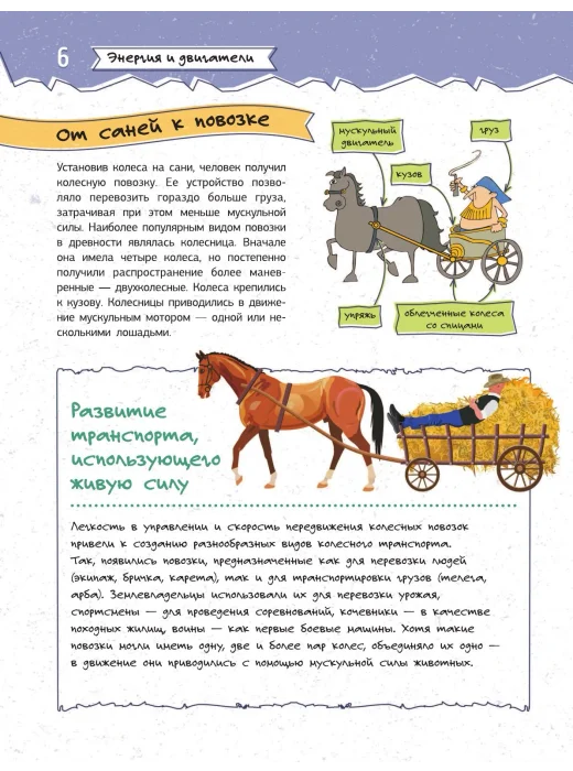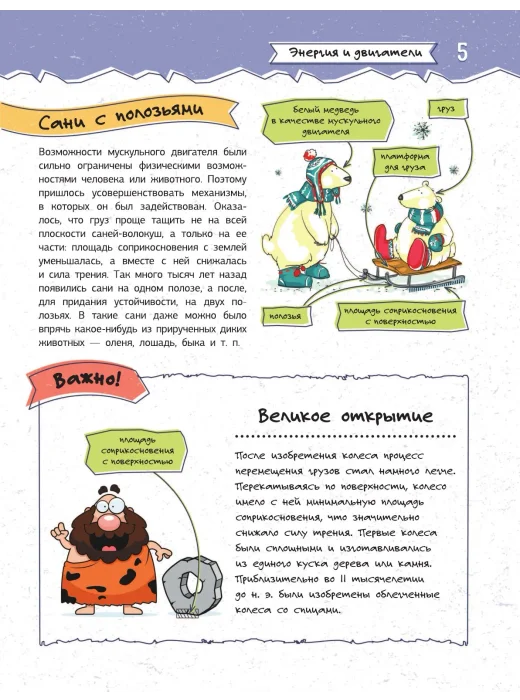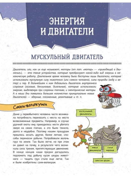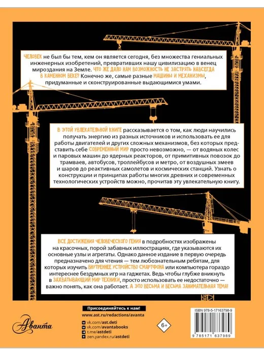Человек не был бы тем, кем он является сегодня, без множества гениальных инженерных изобретений, превративших нашу цивилизацию в венец мироздания на Земле. Что же дало нам возможность не застрять навсегда в каменном веке? Конечно же, самые разные машины и механизмы, придуманные и сконструированные выдающимися умами. В этой увлекательной книге рассказывается о том, как люди научились получать энергию из разных источников и использовать ее для работы двигателей и других сложных механизмов, без которых представить себе современный мир просто невозможно, — от водяных колес и паровых машин до ядерных реакторов, от примитивных повозок до трамваев, автобусов, троллейбусов и метро, от воздушных змеев и шаров до реактивных самолетов и космических станций. Узнать о конструкции и принципах работы многих древних и современных технологических устройств можно, прочитав эту увлекательную книгу. Все достижения человеческого гения в подробностях изображены на красочных, порой забавных иллюстрациях, где указываются их основные узлы и агрегаты. Однако данное издание в первую очередь предназначено для чтения — тем любознательным ребятам, для которых изучить внутреннее устройство смартфона или компьютера гораздо интереснее бездумных игр на гаджетах. Ведь чтобы глубже вникнуть в захватывающий мир техники, просто использовать ее недостаточно — важно понять, как она работает. А это весьма и весьма занимательная тема!