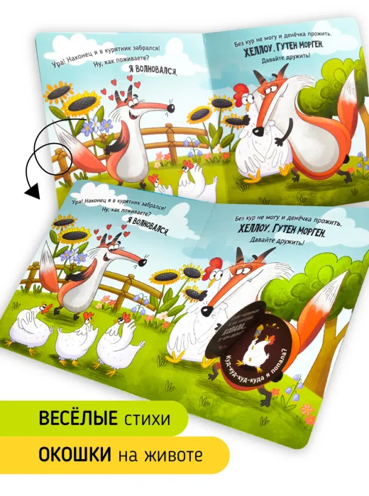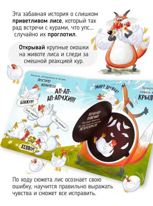 Эта забавная история о слишком приветливом лисе, который так рад встречи с курами, что Упс случайно их проглотил. Открывай крупные окошки на животе лиса и следи за смешной реакцией кур. По ходу сюжета лис осознает свою ошибку, научится правильно выражать чувства и сможет все исправить.